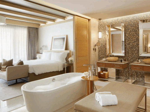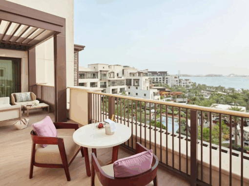 As acomodações são projetadas para harmonizar o conforto moderno com vistas deslumbrantes — muitos quartos e suítes contemplam jardins tropicais ou o mar, e também oferecem vista para o icônico Burj Al Arab.